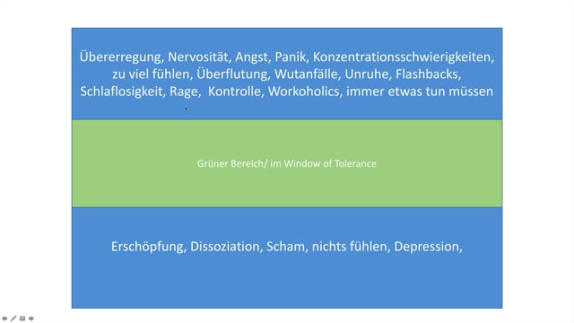 So zirkeln Leute vom oberen in den unteren Bereich und wieder zurück, aber eigentlich geht es immer um das Gleiche, nämlich darum, dass die Selbstregulationsfähigkeit nicht vorhanden ist. Wenn wir diese erhöhen, kann es sein, dass das Window of Tolerance auf einmal größer wird und gewisse Ausschläge den Normalbereich nicht mehr verlassen, sich die Wahrnehmung von Erlebnissen völlig verändert und diese plötzlich regulierbar sind.